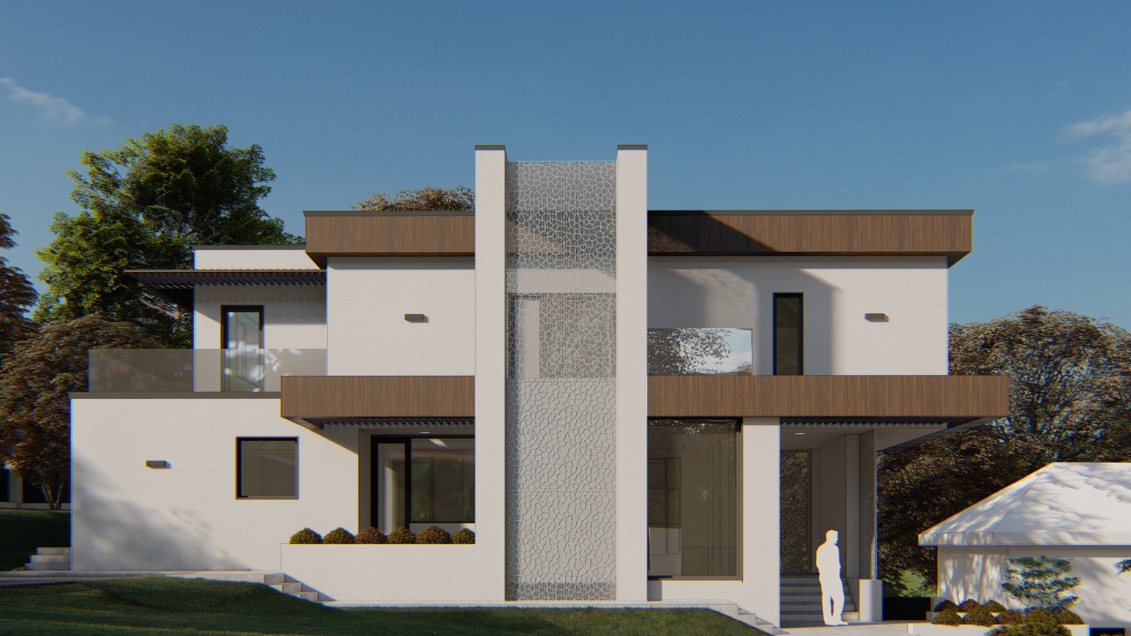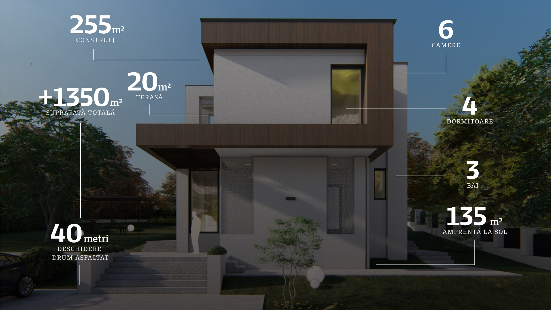 Cu un teren de 1350 mp, dispune de 6 camere, 3 băi, terasă de 20 mp.
